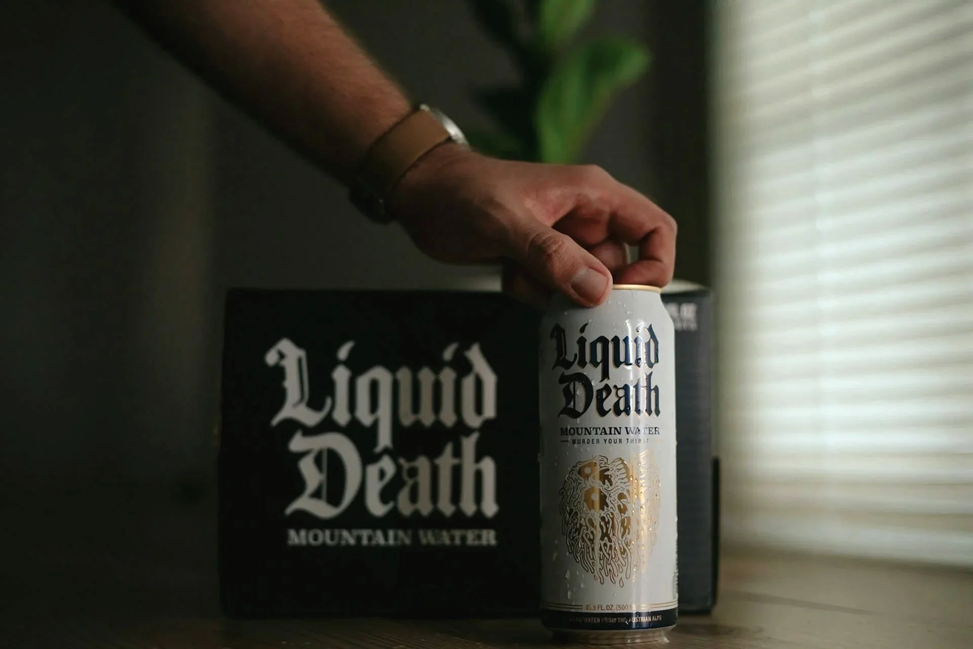 Liquid Death’s black and white cans turn bottled water into a rebellious lifestyle statement—hydration meets heavy metal. Source: Unsplash